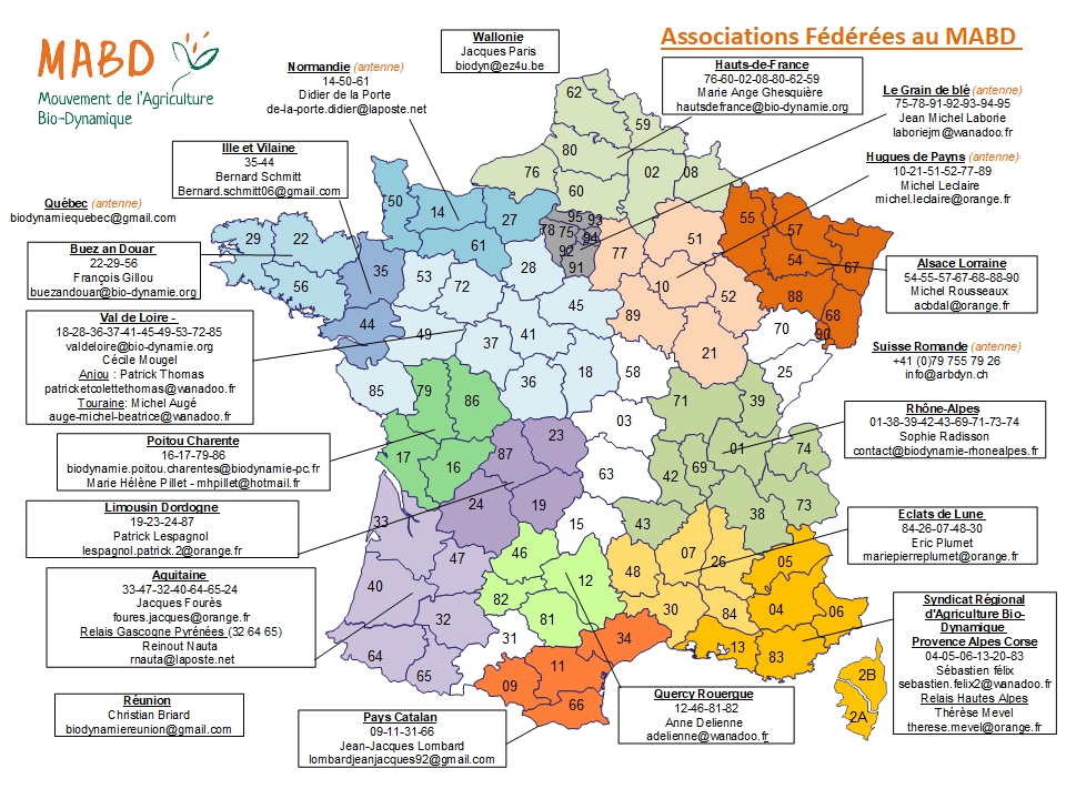 Vous trouverez ci-dessous la liste et la carte des associations régionales en biodynamie fédérées au MABD, antennes et des relais proches de chez vous.